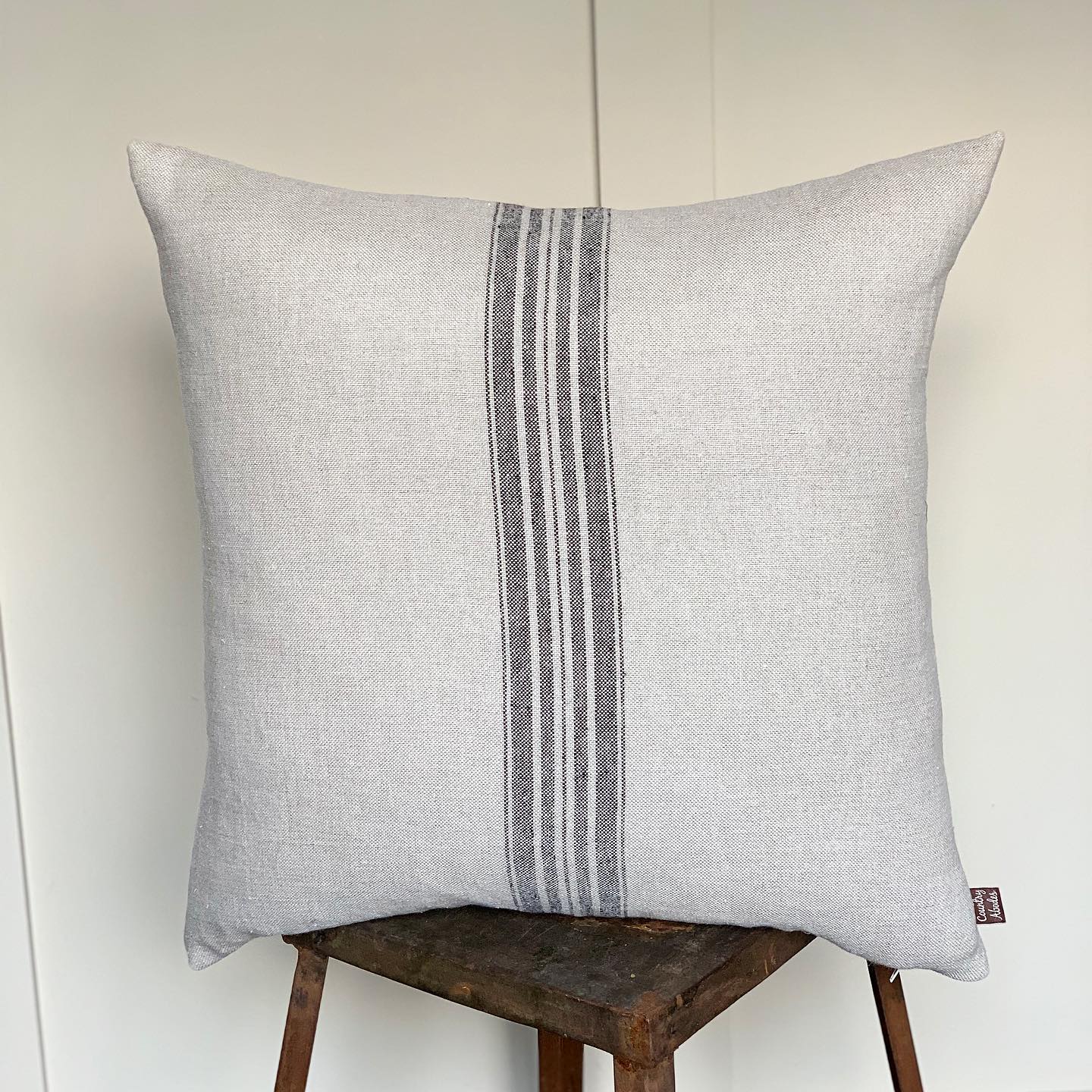 Charcoal Grain Sack Cushion. Made from a beautiful thick grain sack linen, with a central stripe which wraps around both the front and back. Features a hidden zipper fastening.