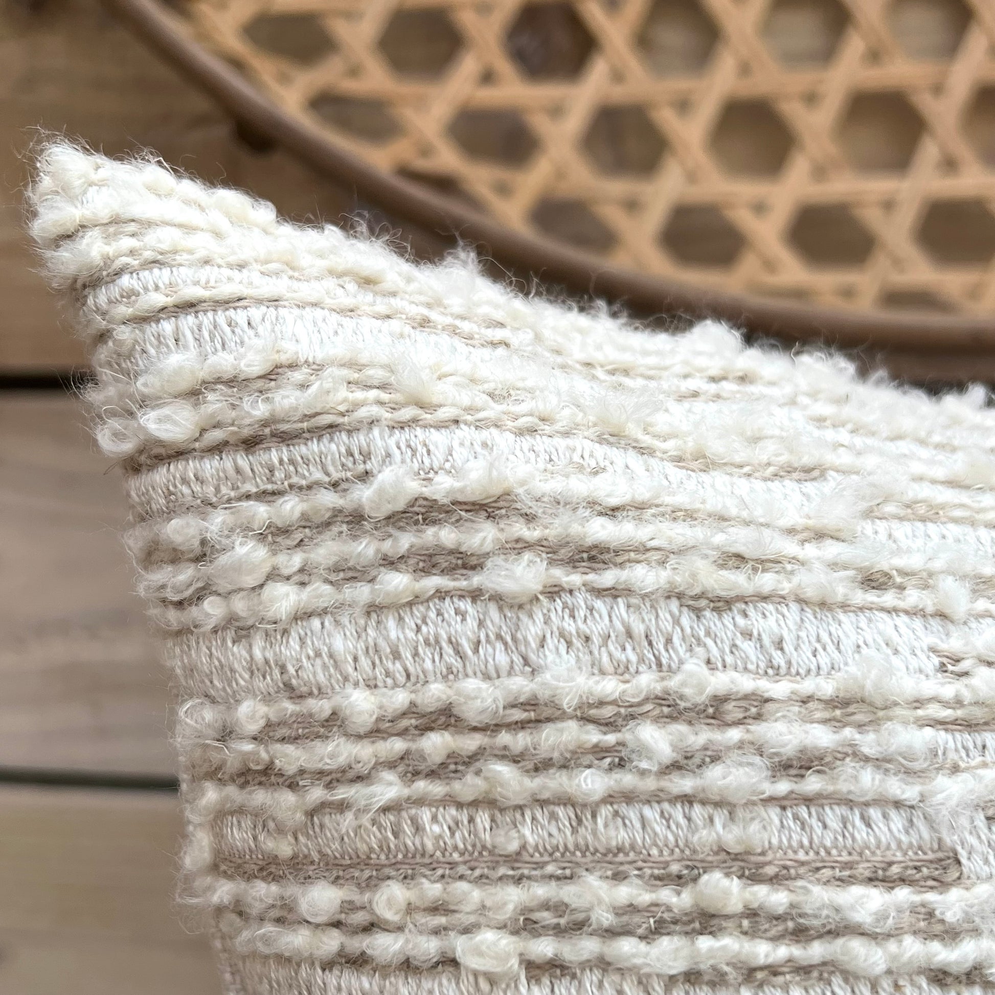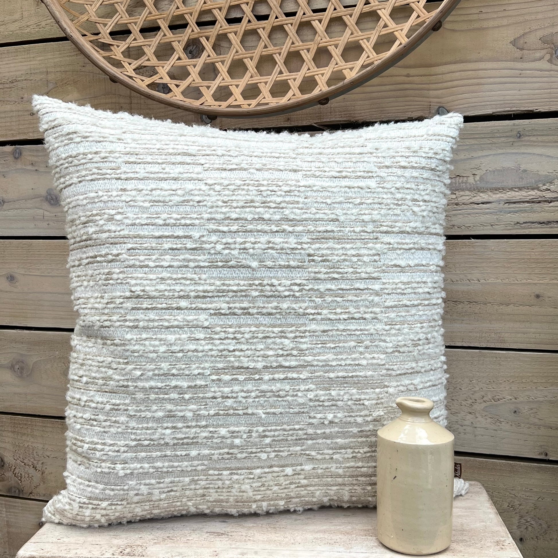 Clayton Ivory Cushion, made from a rustic textured, boucle, multi-tonal weave front, with a plain back. Features a hidden zipper, and a plump feather inner, also available as cover only.