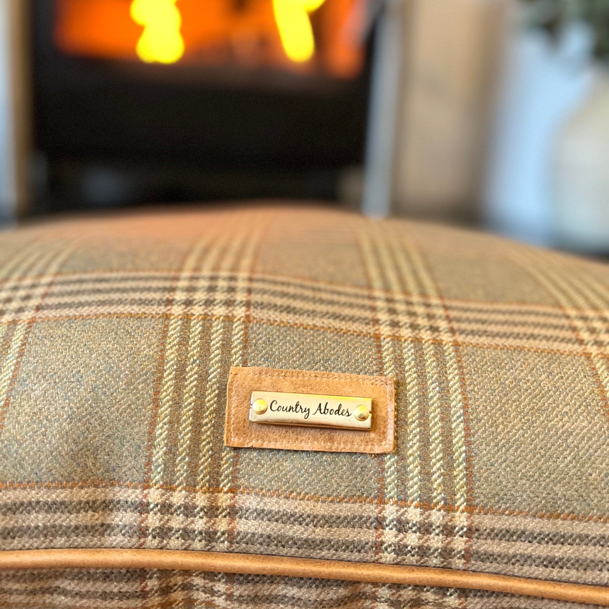 Hand made from stunning Scottish wool tweed fabric, adorned with our logo name plate, fixed onto a sewn leather badge. The dog bed has a zip fastening and comes with a hollow fibre inner pad. Making them luxuriously comfy as well as super stylish.