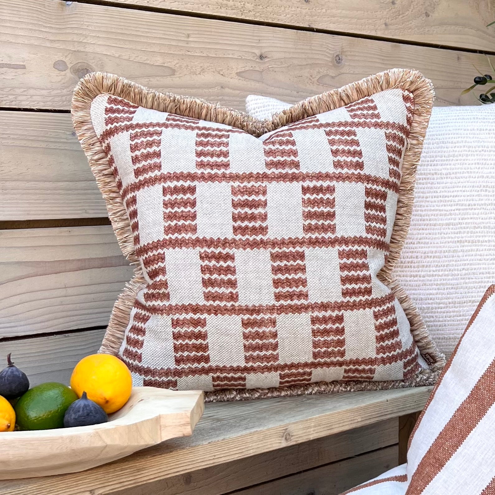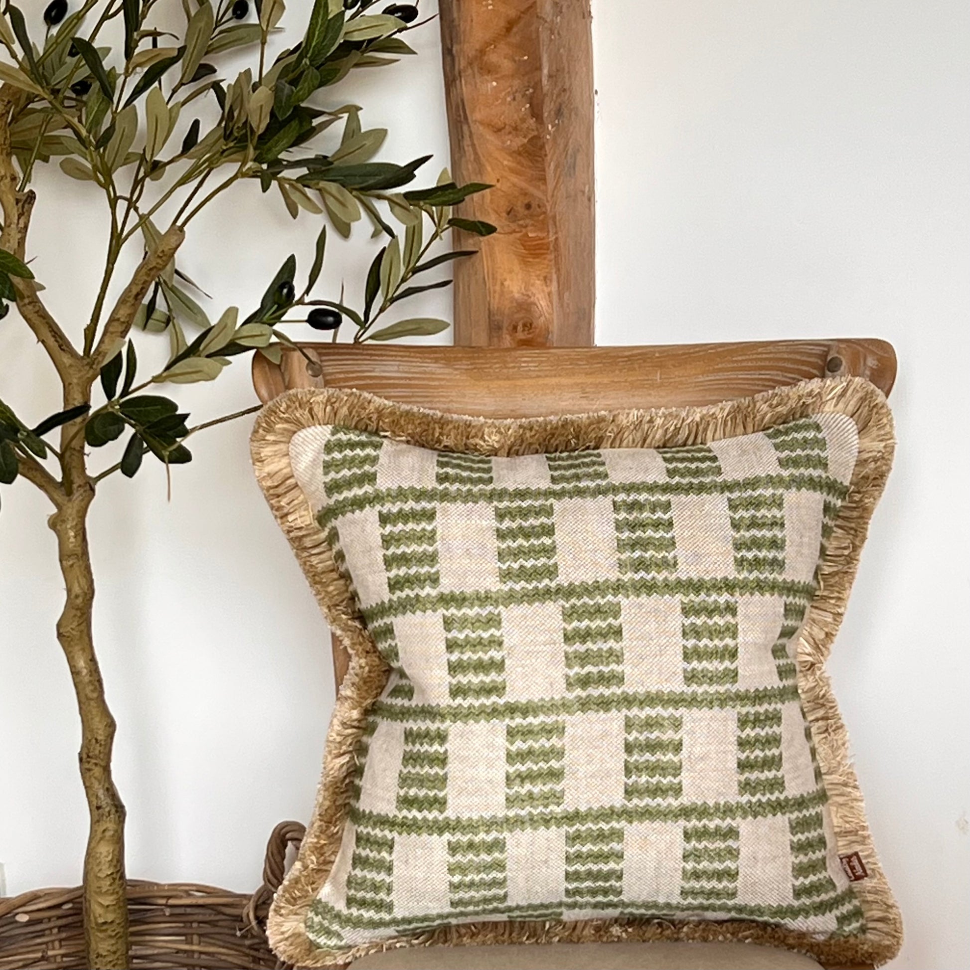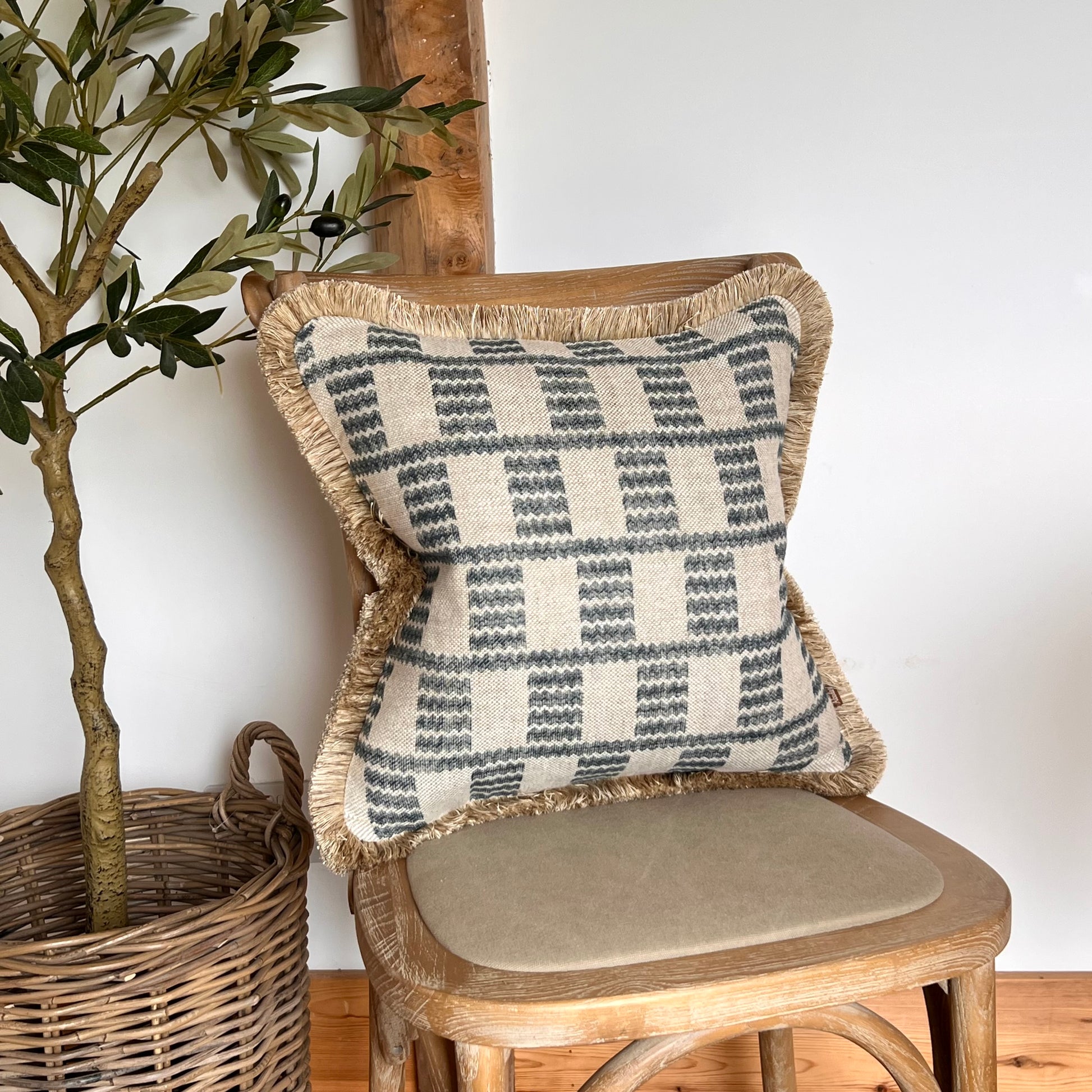 Fermoie Cove fabric Cushion, hand made with a stunning a linen geometric pattern on the front, with a beautiful, with a choice of with or without thick fringing edging, with a plain back.