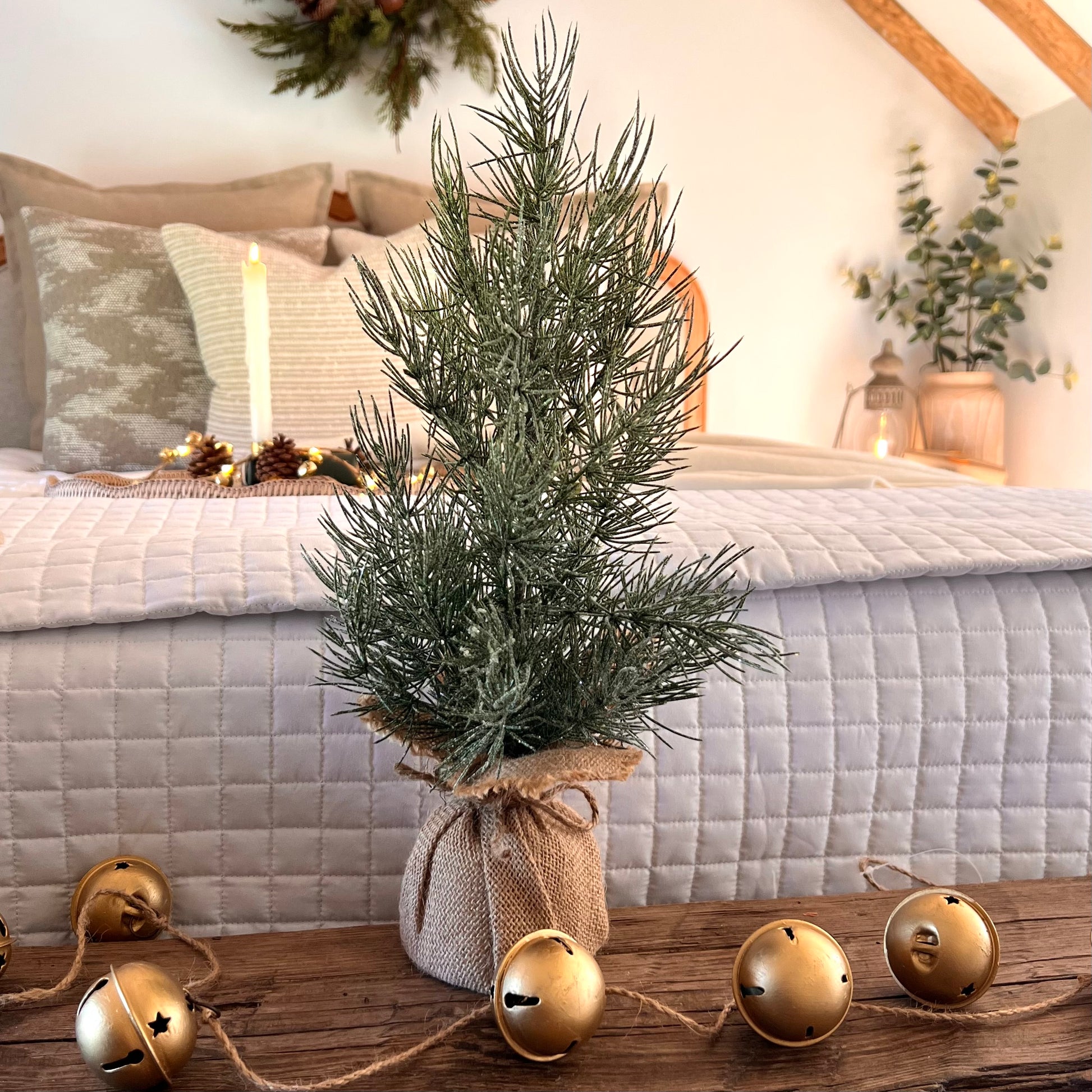 Our Frosted Pine Tree wrapped in jute fabric, and a pair of antique brass bells, is the ideal height for a low table or sideboard. A lovely alternative to a decorated Christmas tree, or for a little added festive decor.