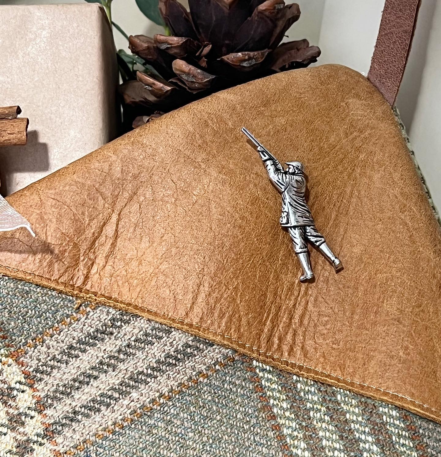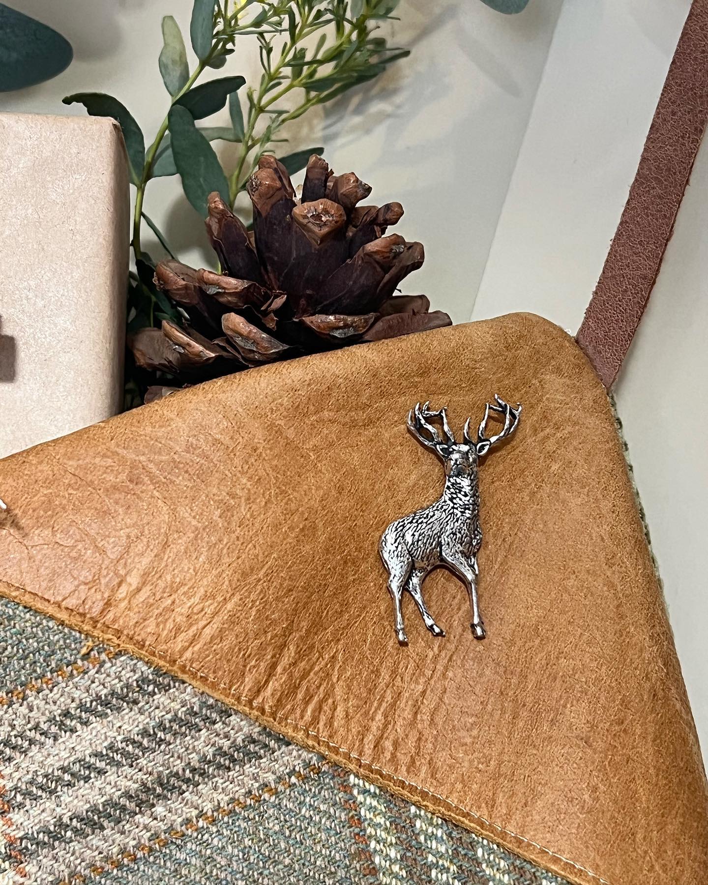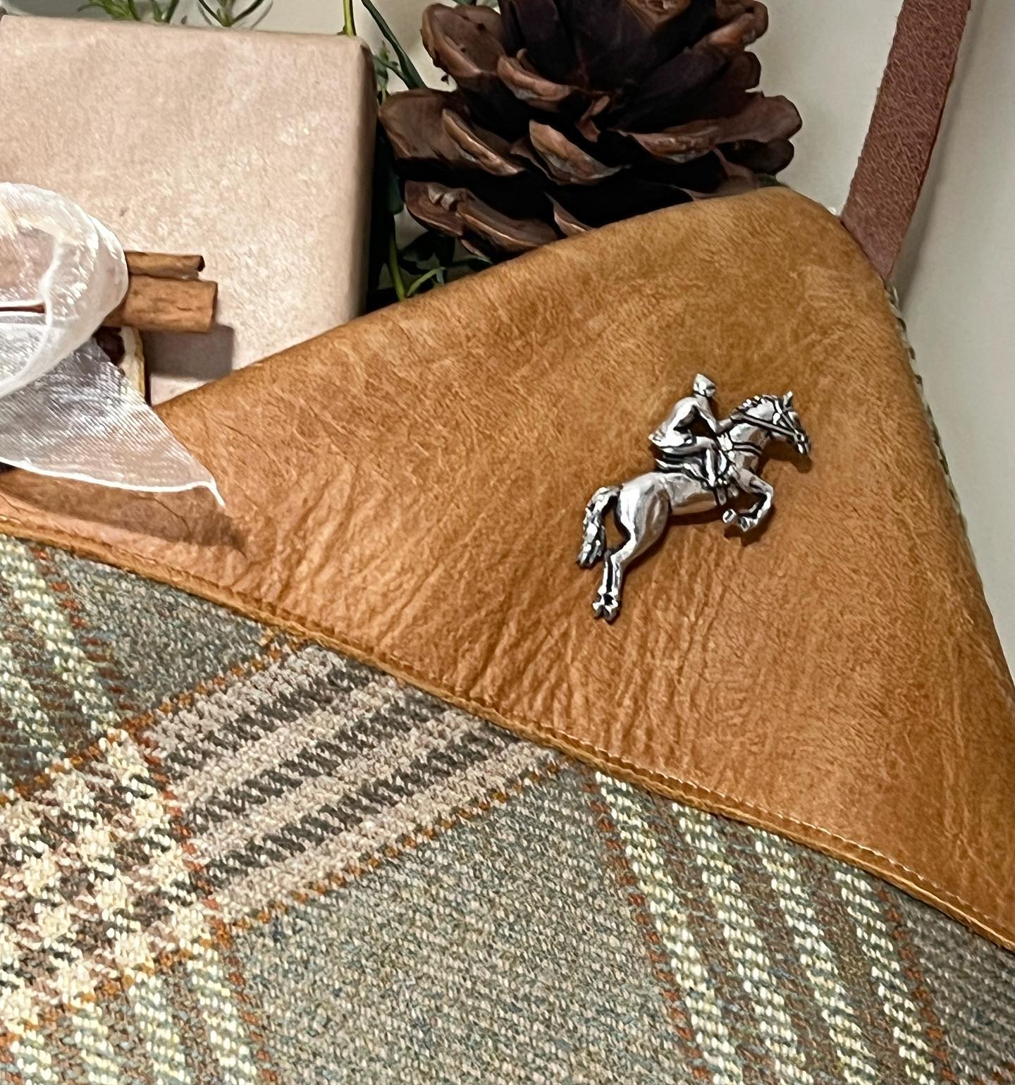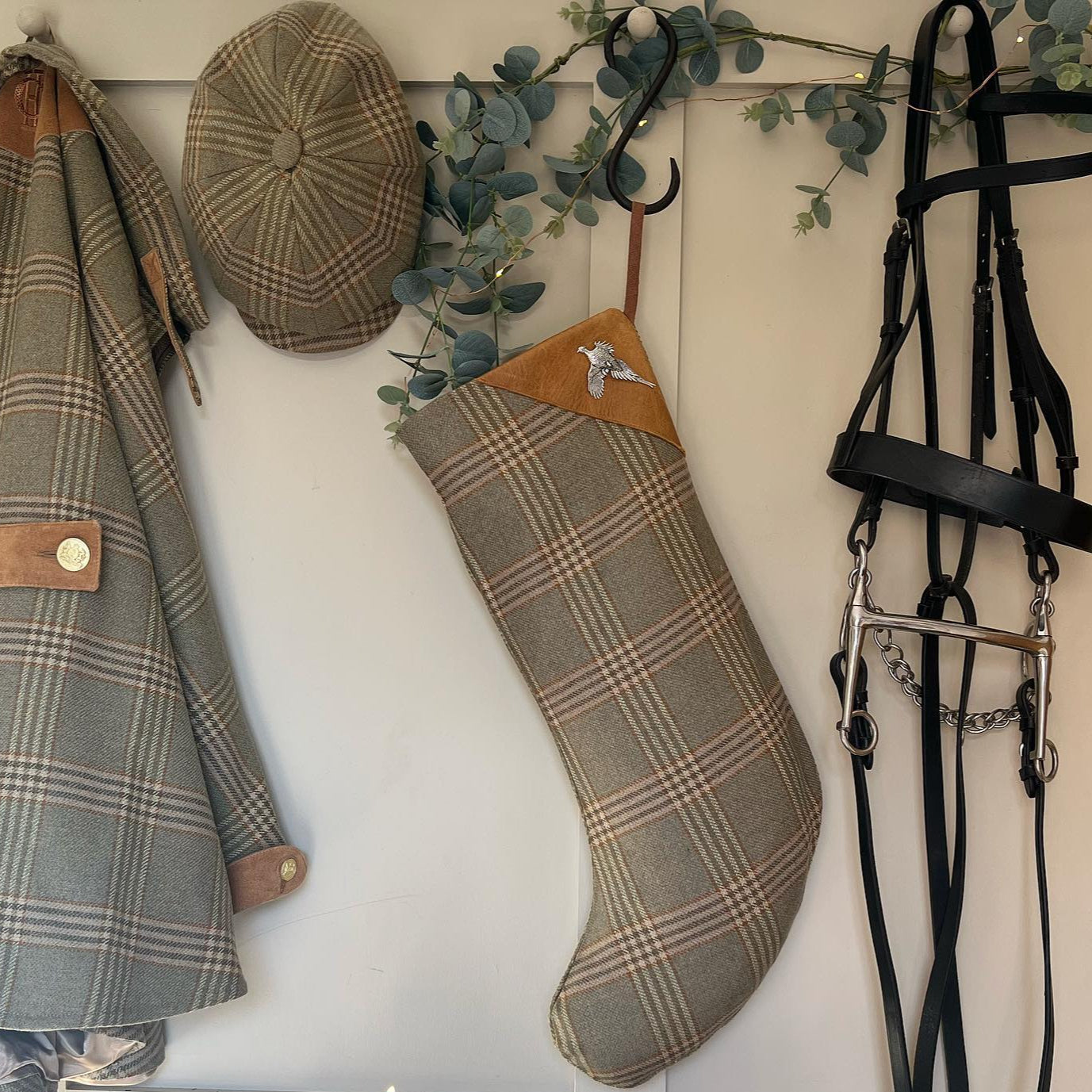 Tweed and Leather Christmas Stocking. Made from the most beautiful tweeds, which we have teamed with super soft leather. Each Stocking is adorned with a Pewter pin of your choice; Stag, Show jumping Horse, Man Shooting, Pheasant. Altos available with a pin.