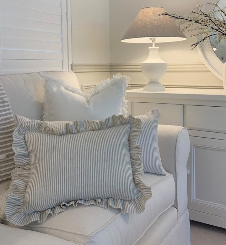 Our Indi Cushion is handmade with ruffle edging, around each side, made in a fine stripe beautiful linen fabric. With the same fabric on the front and back.