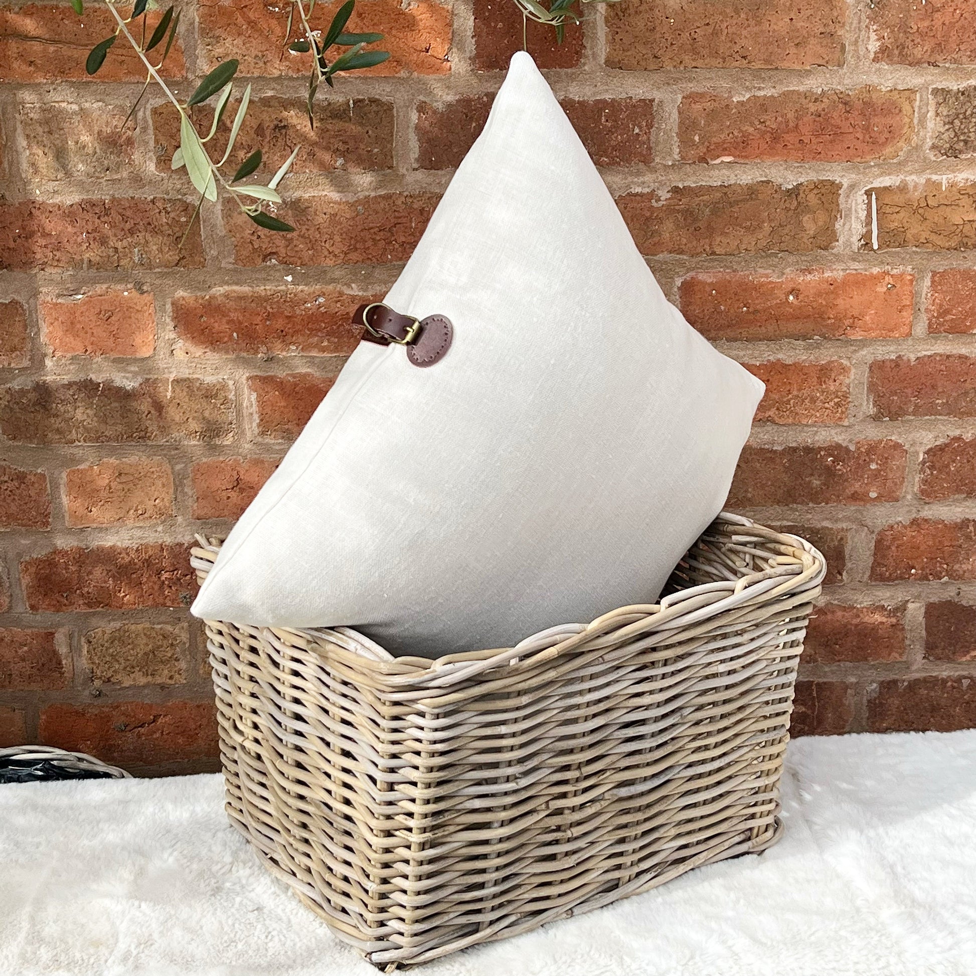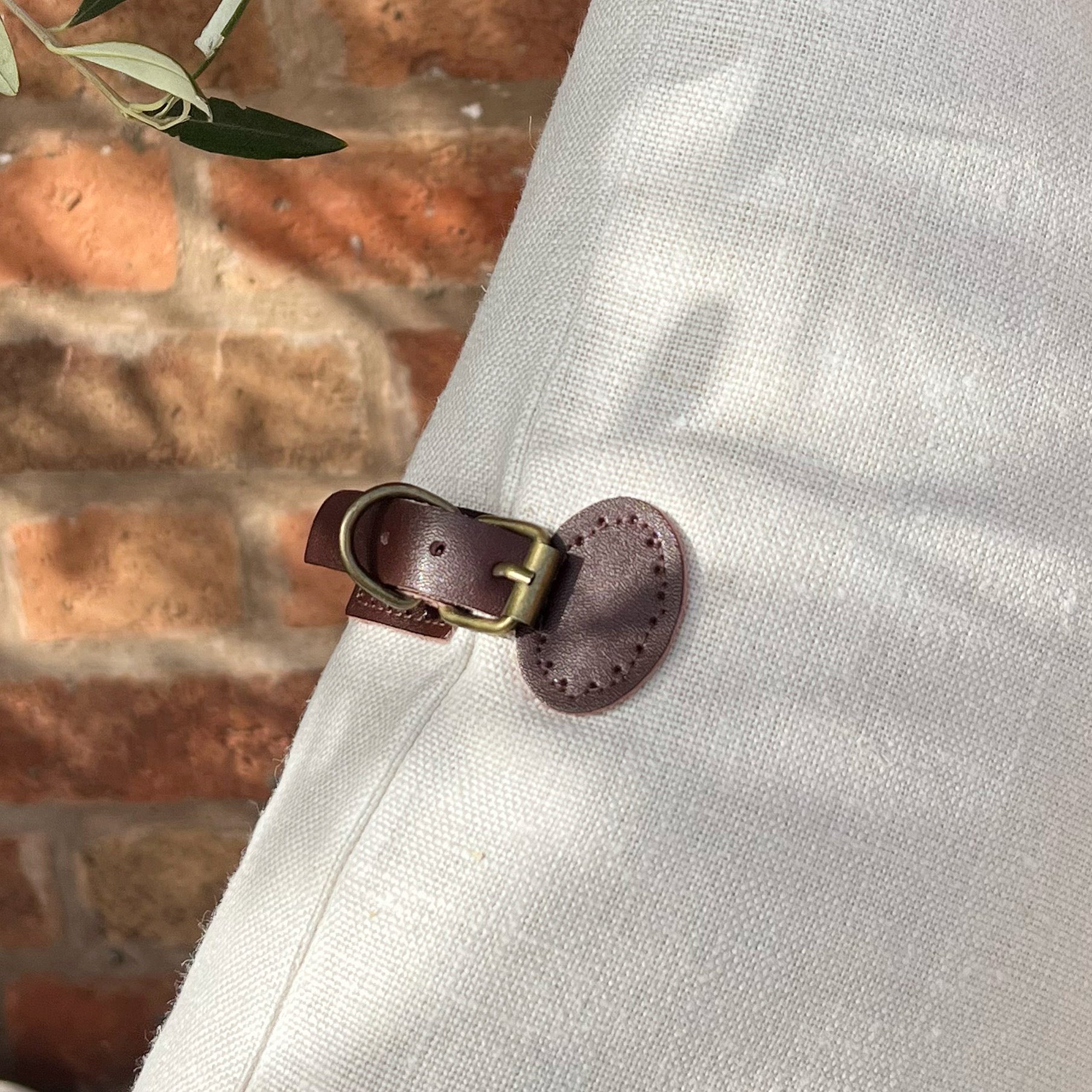 Leather Buckle Cushion, featuring a leather and brass buckle on each of the vertical sides. This cushion is made from gorgeous Peony and Sage Grain Sack Fabric on both sides. A linen we use in many of our other cushions, so it ties in seamlessly with many of our other ranges