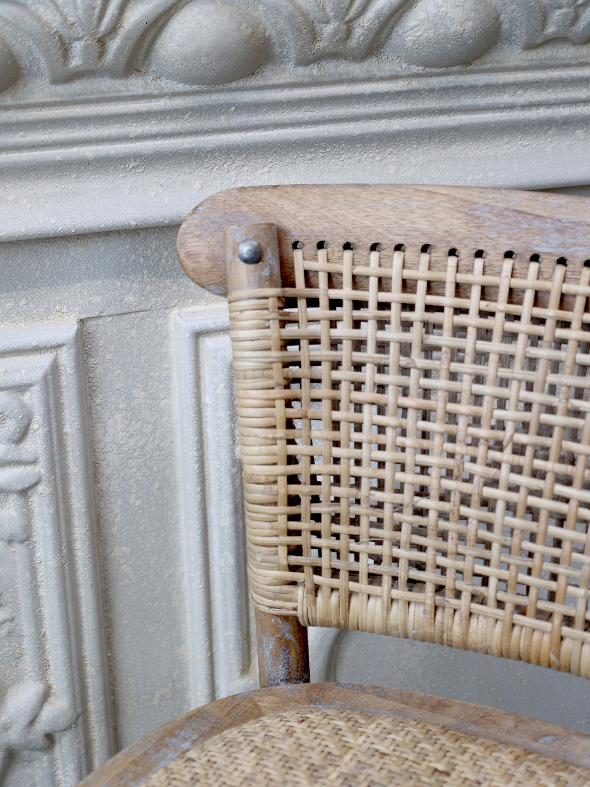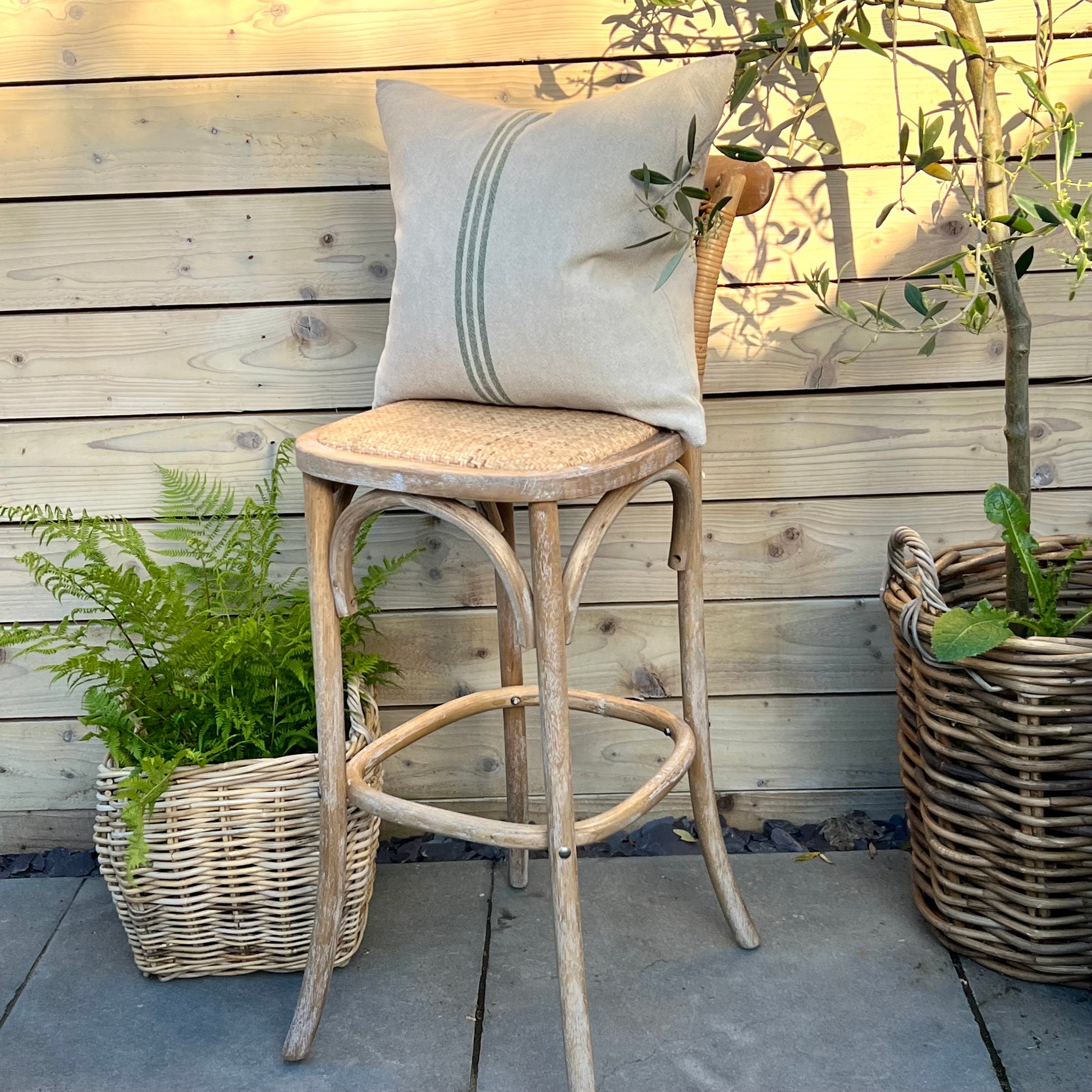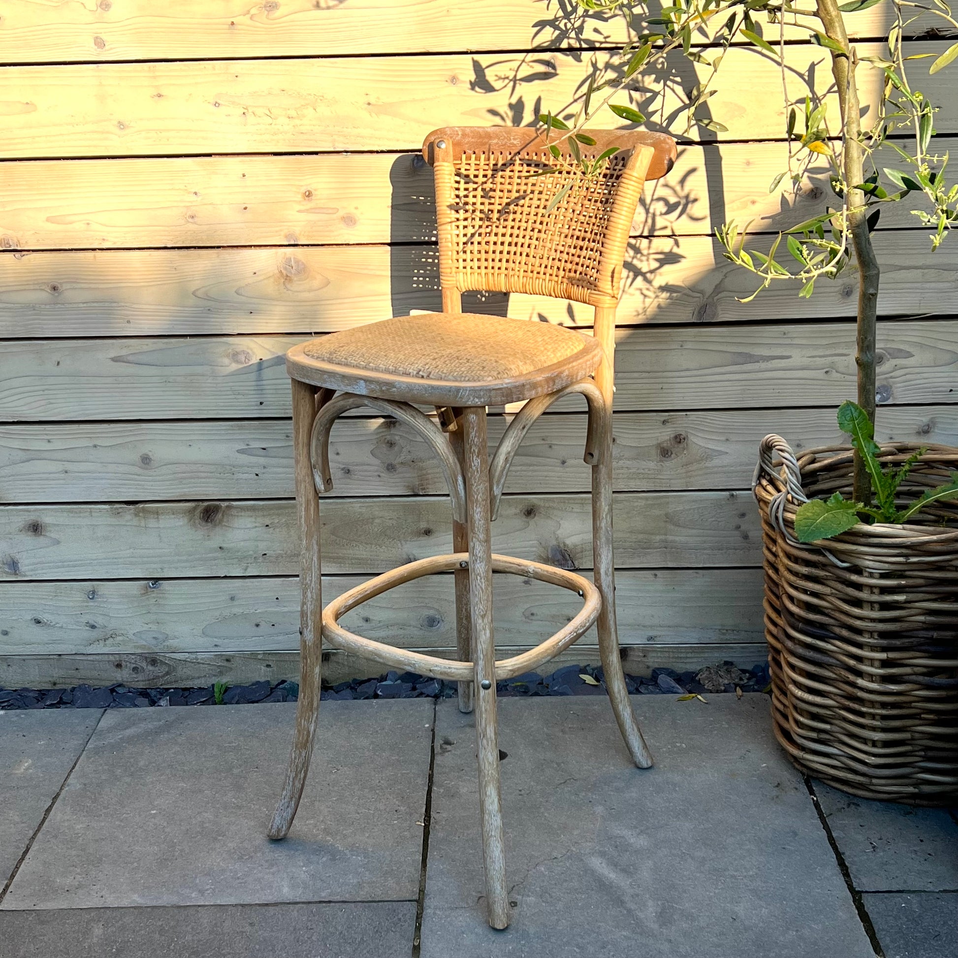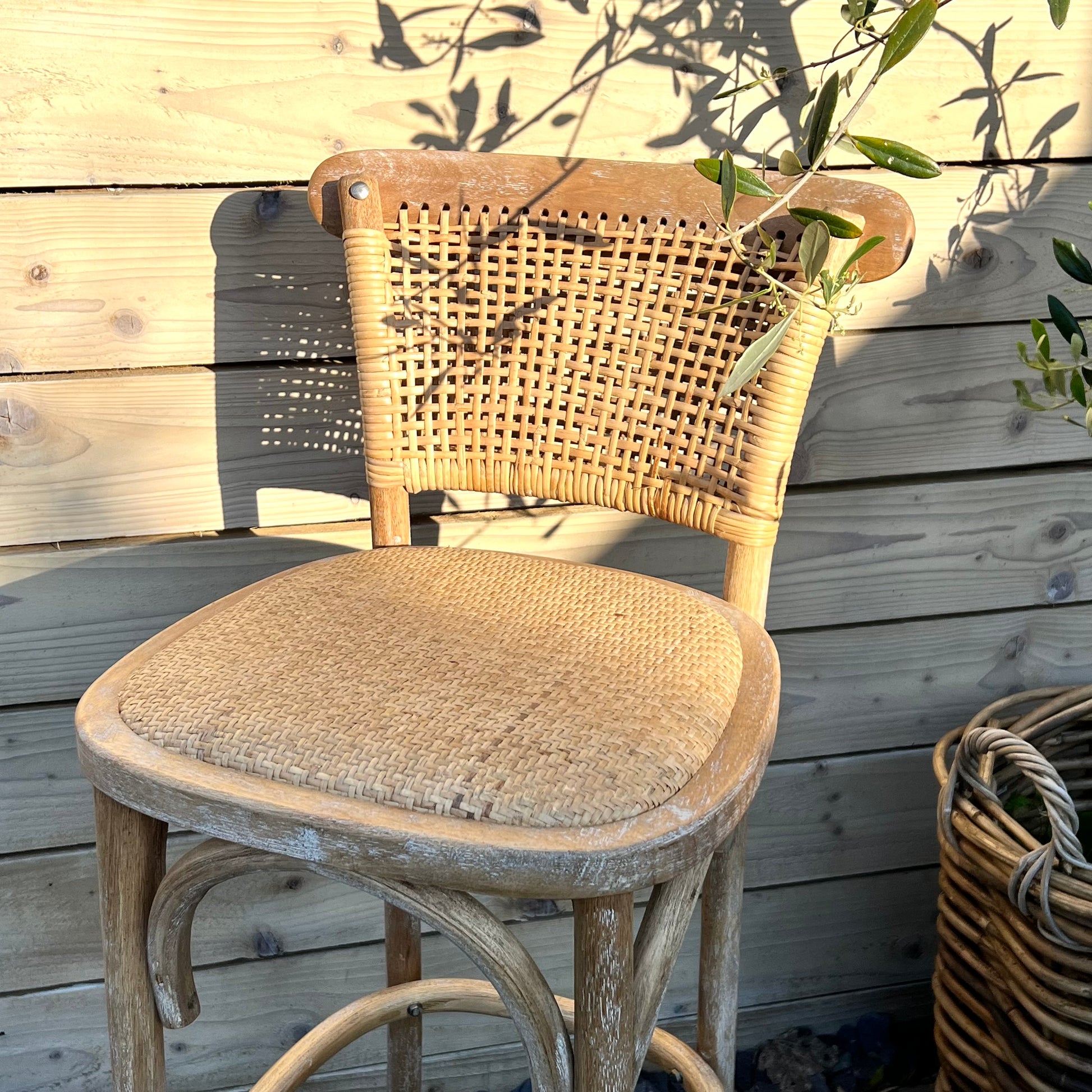 Beautiful natural wooden stool, handmade using natural materials. With a woven wicker back with solid wood rattan seat. The wood has a natural soft washed finish.