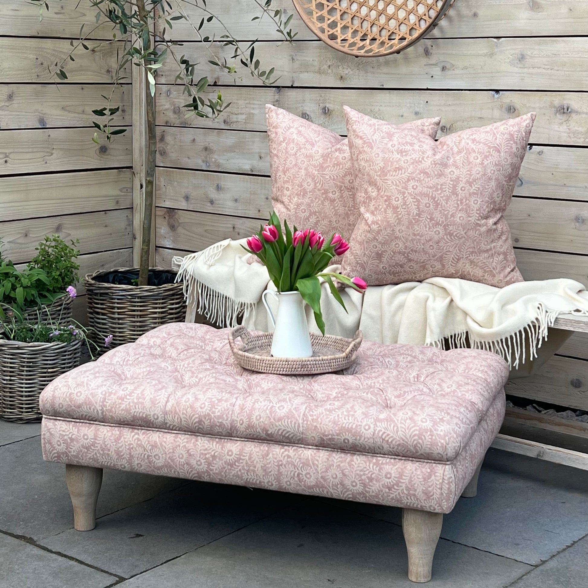 The footstools are handmade, with extremely close attention to detail. They feature pencil pleated corners and a piped border, deep buttoning with hand made coordinated buttons, they come with hard wooden legs, with or without brass castors.