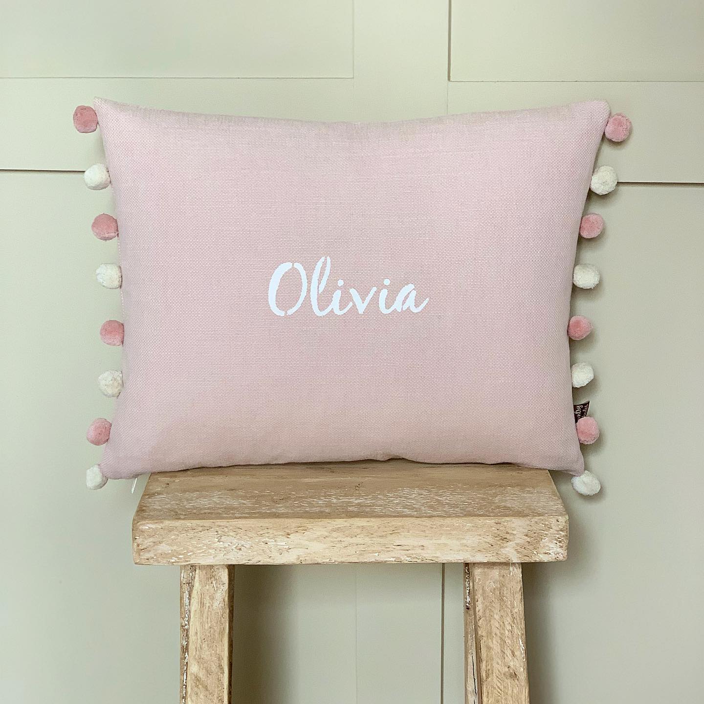 Our Personalised Oblong Cushions With Pompoms are perfect for children's bedrooms. They are made with the same beautiful linen mix fabric on both sides with a hidden zipper. They come in a choice of colours and pompoms options as well as filler options too.