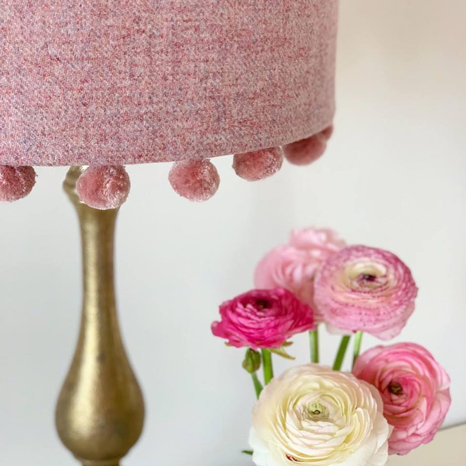 Our handmade Pompom lampshade is made with pink, pure wool tweed, edged with velvet pompom for that little bit of luxury. These lampshades go perfectly with our matching Pompom Cushions.
