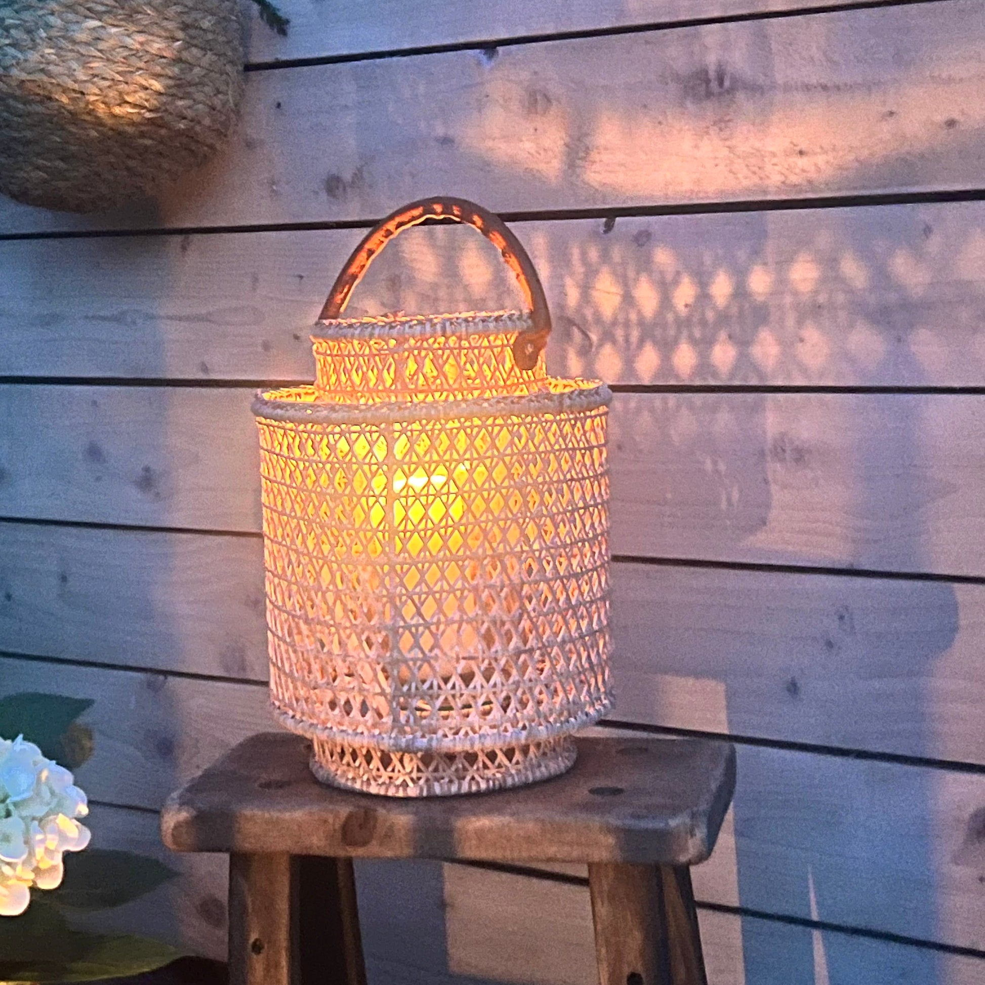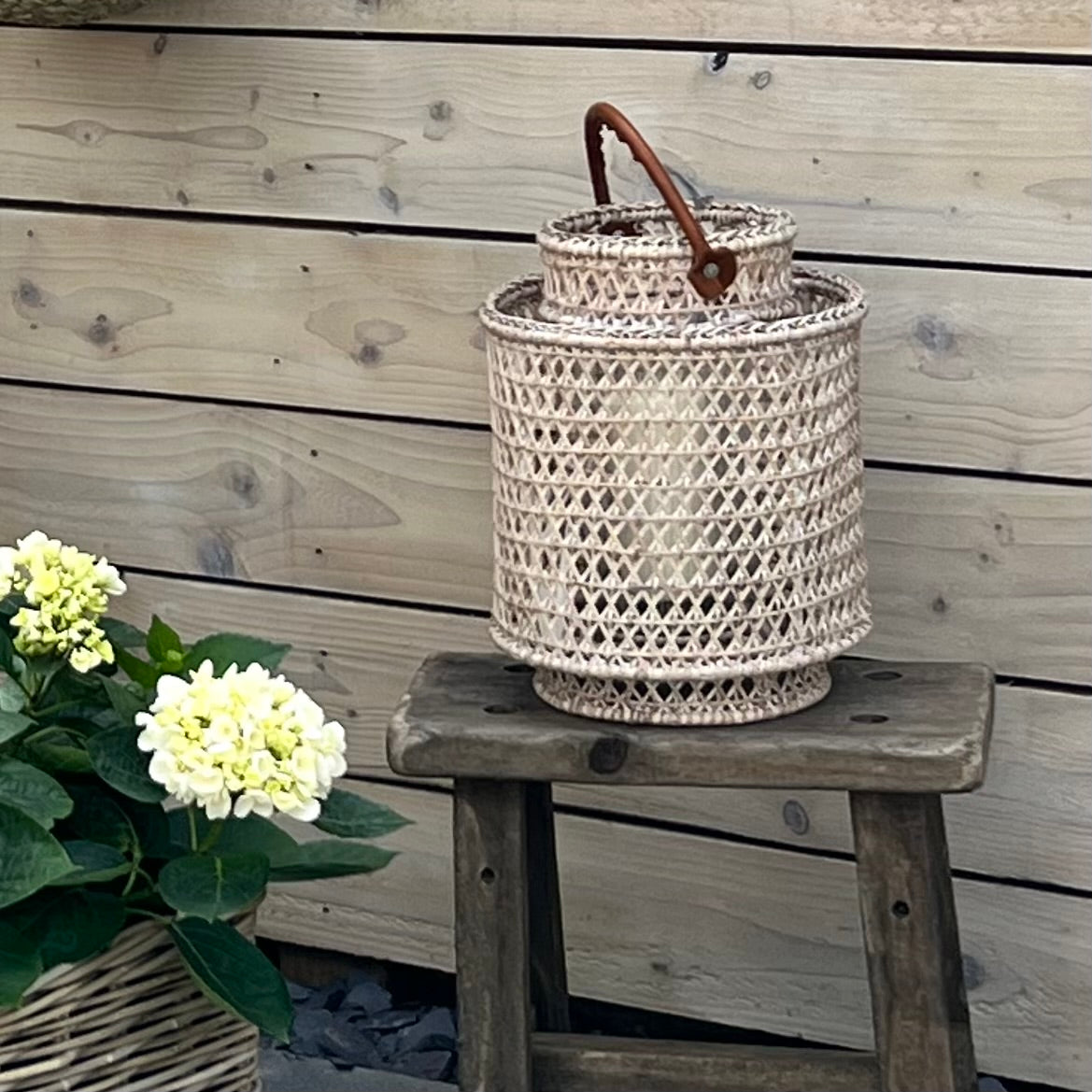 Round Rattan Lantern, beautifully hand made with an open weave and glass candle holder and leather handle.