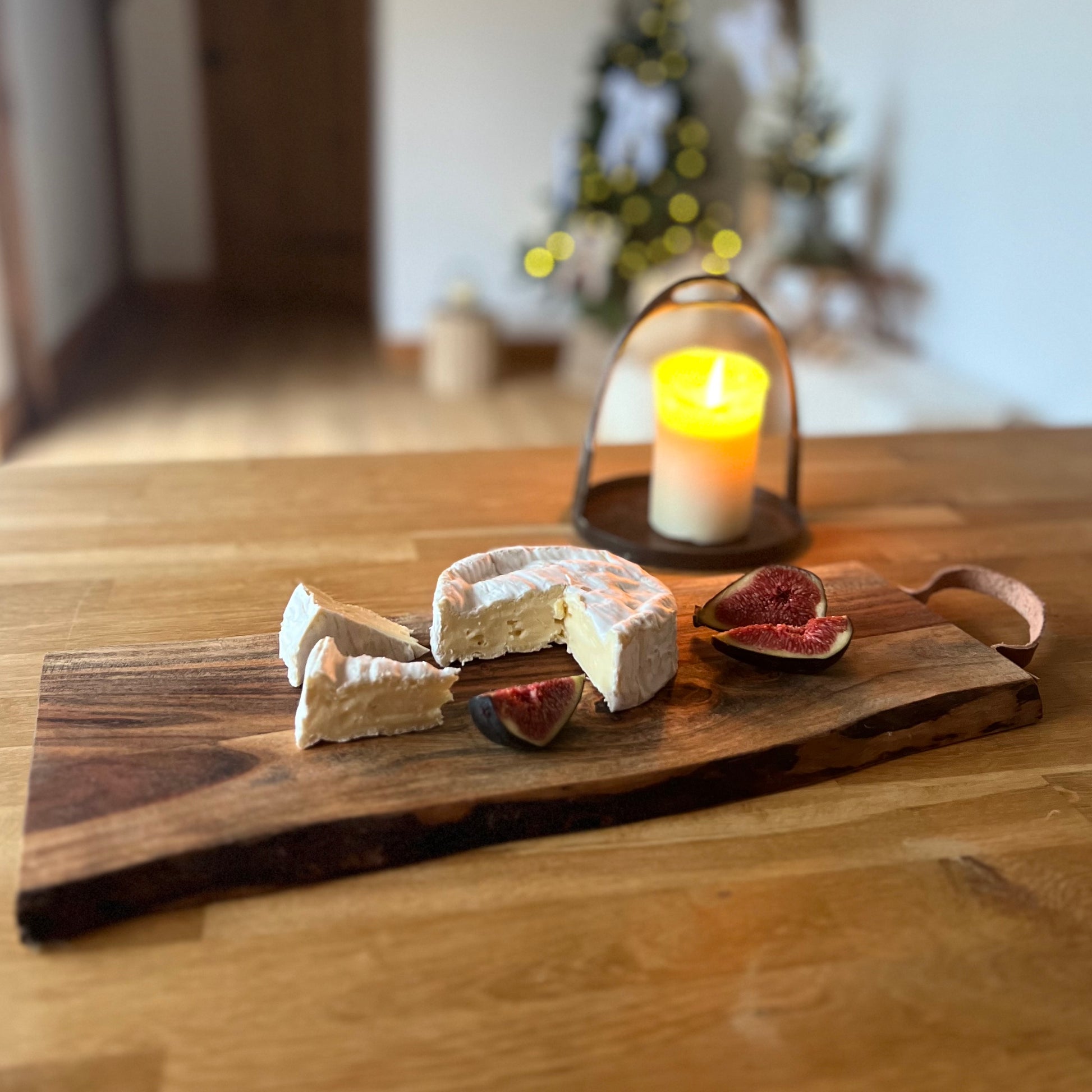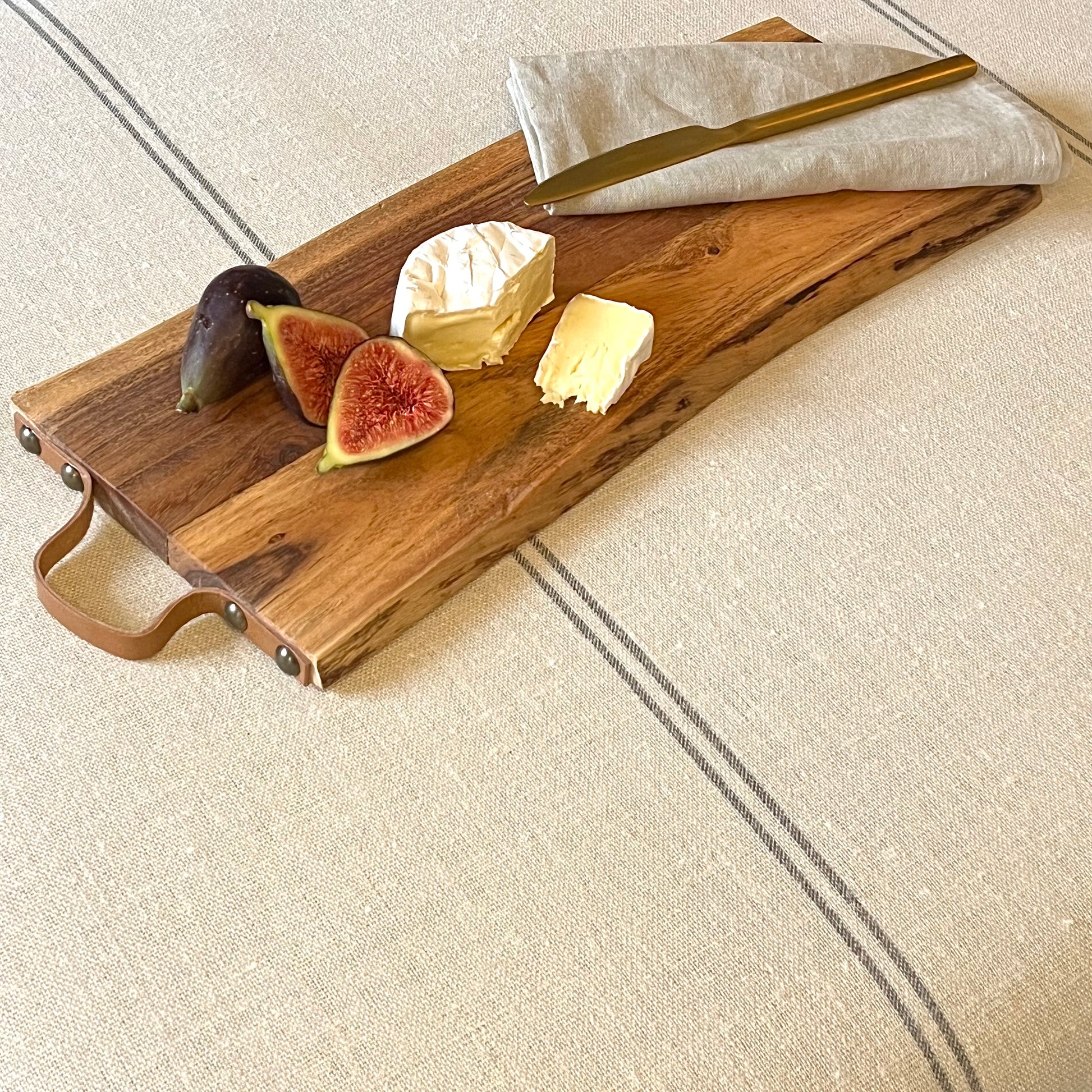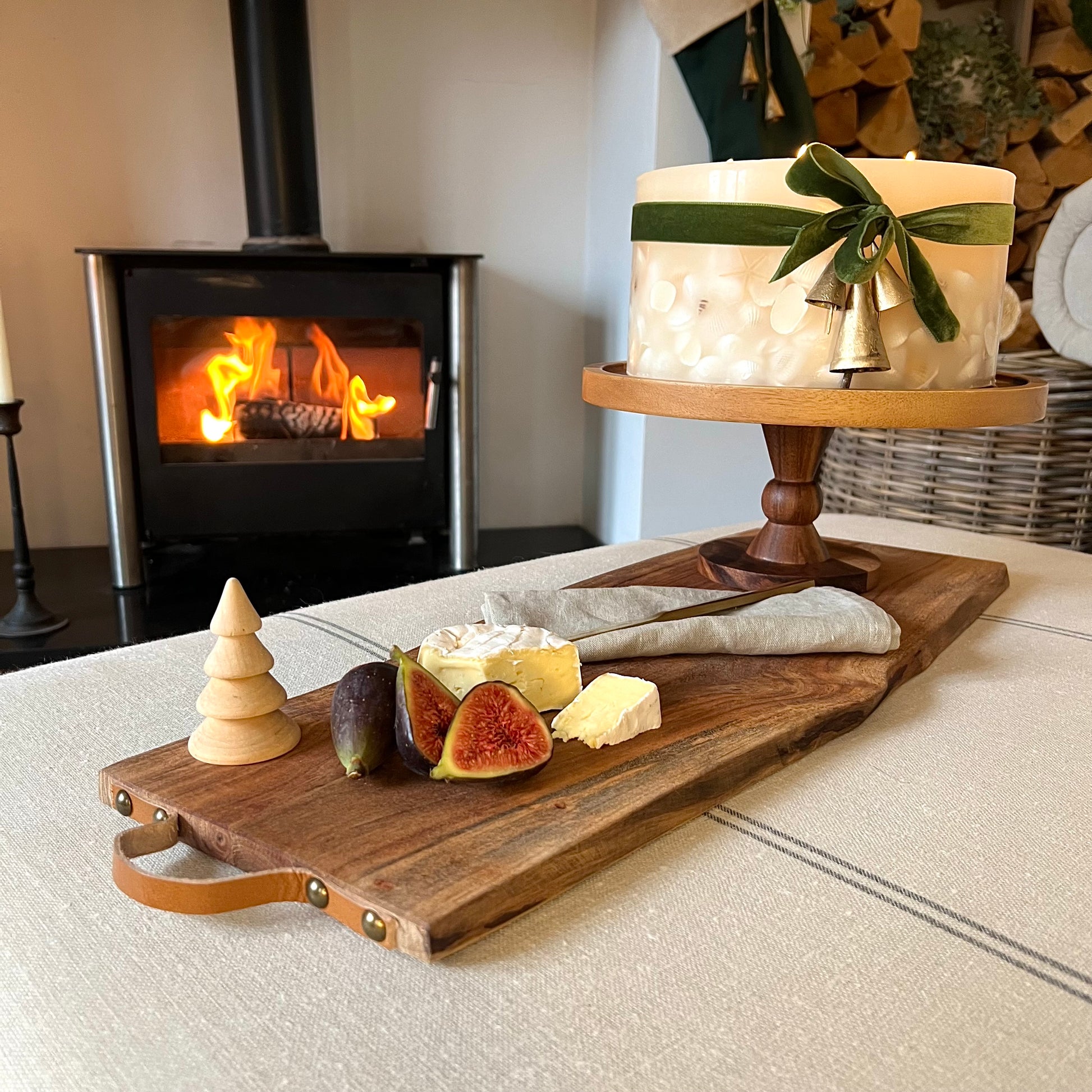 Rustic Serving Boards, made from natural edge acacia, with a leather handle for hanging. A perfect presentation board for any occasion. Each piece has its own unique rustic charm – and will vary in shape and size a little. If you are looking for uniform symmetry then these might not be for you!