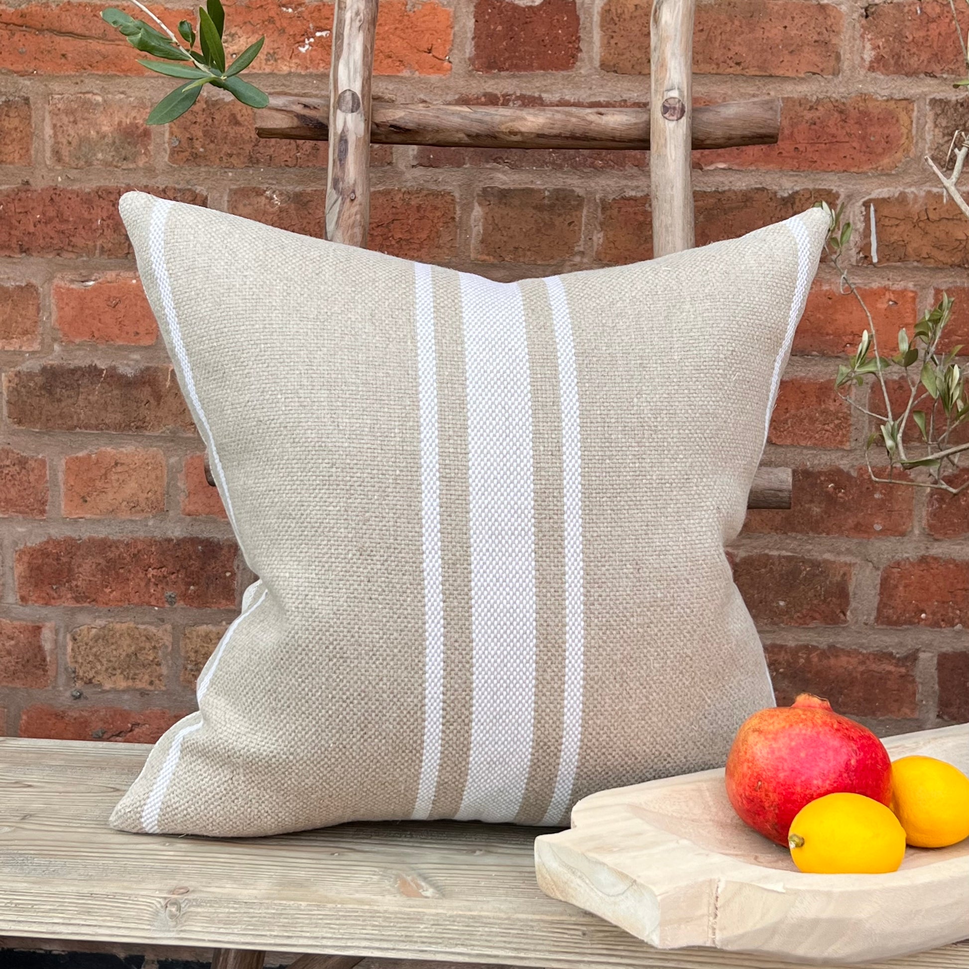 Rustic White Stripe Cushion, created from a beautiful rustic stripe fabric, with a plain back and hidden zip fastening.