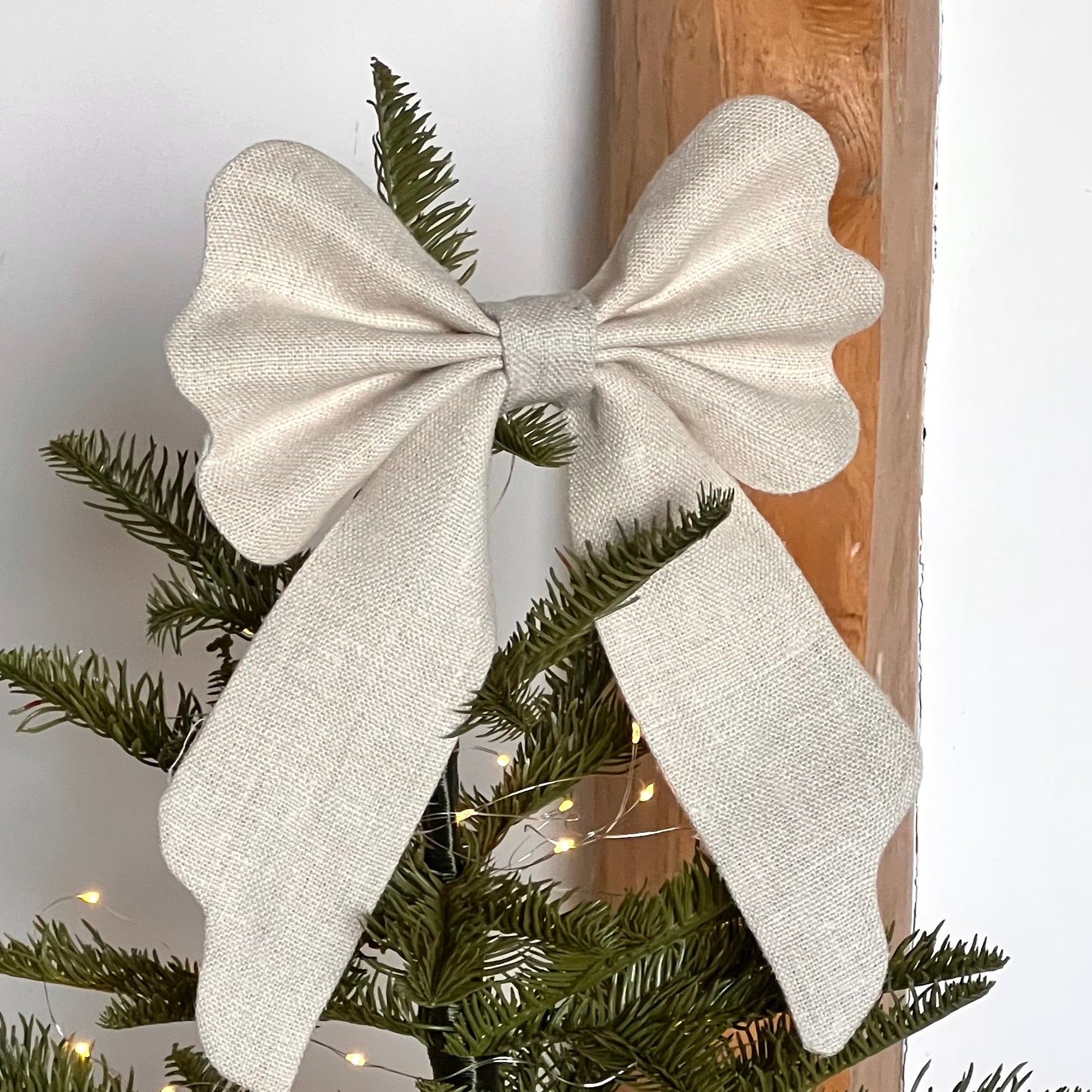 Scalloped Fabric Bow, hand made using gorgeous Peony and Sage Grain sack fabric on the front and coordinating back. Each bow is padded with stiffener, to ensure they stay perky. They come with a ribbon fastening at the back, that can be tied anywhere. Perfectly positioned in any home, on top of the Christmas tree, on a wreath or on a door.