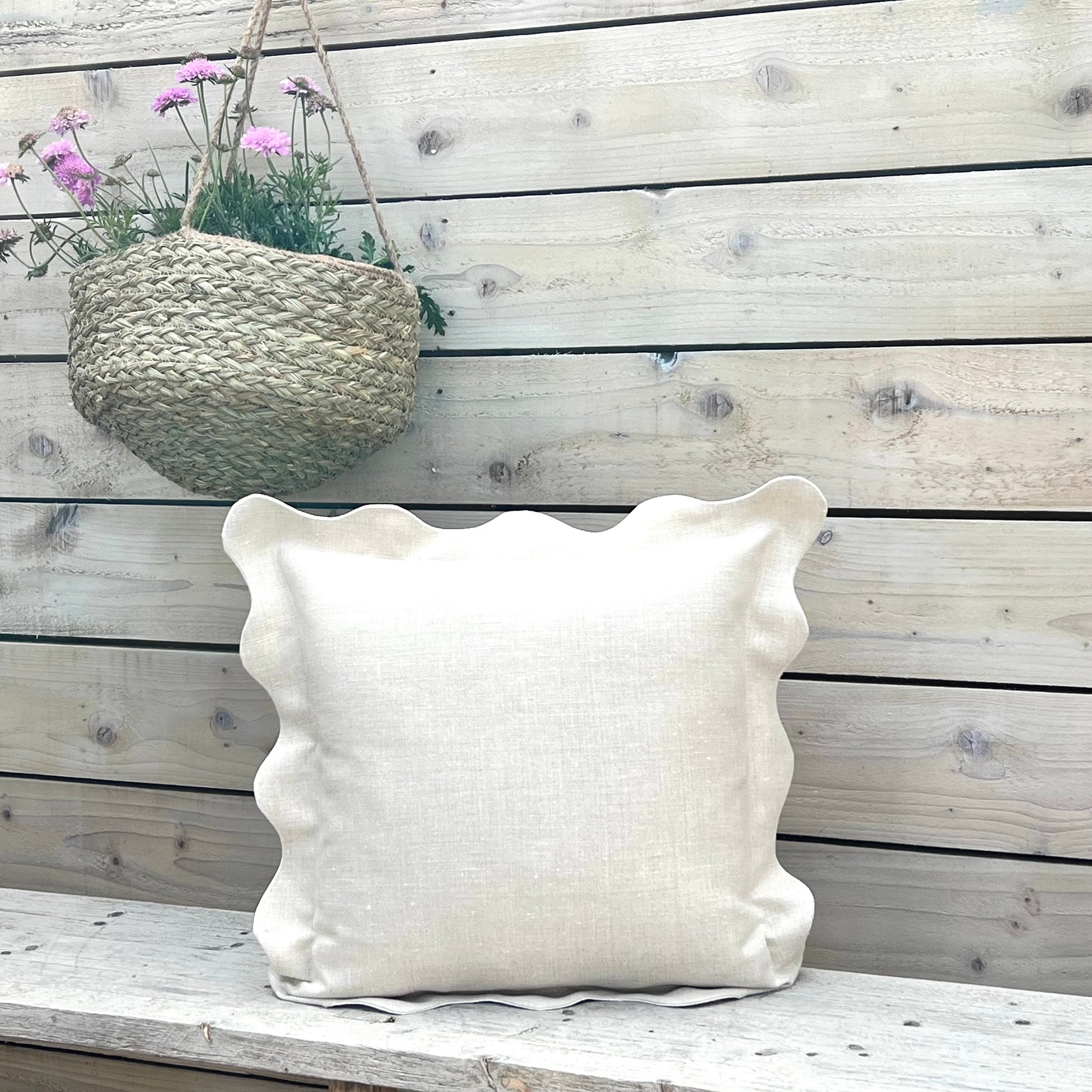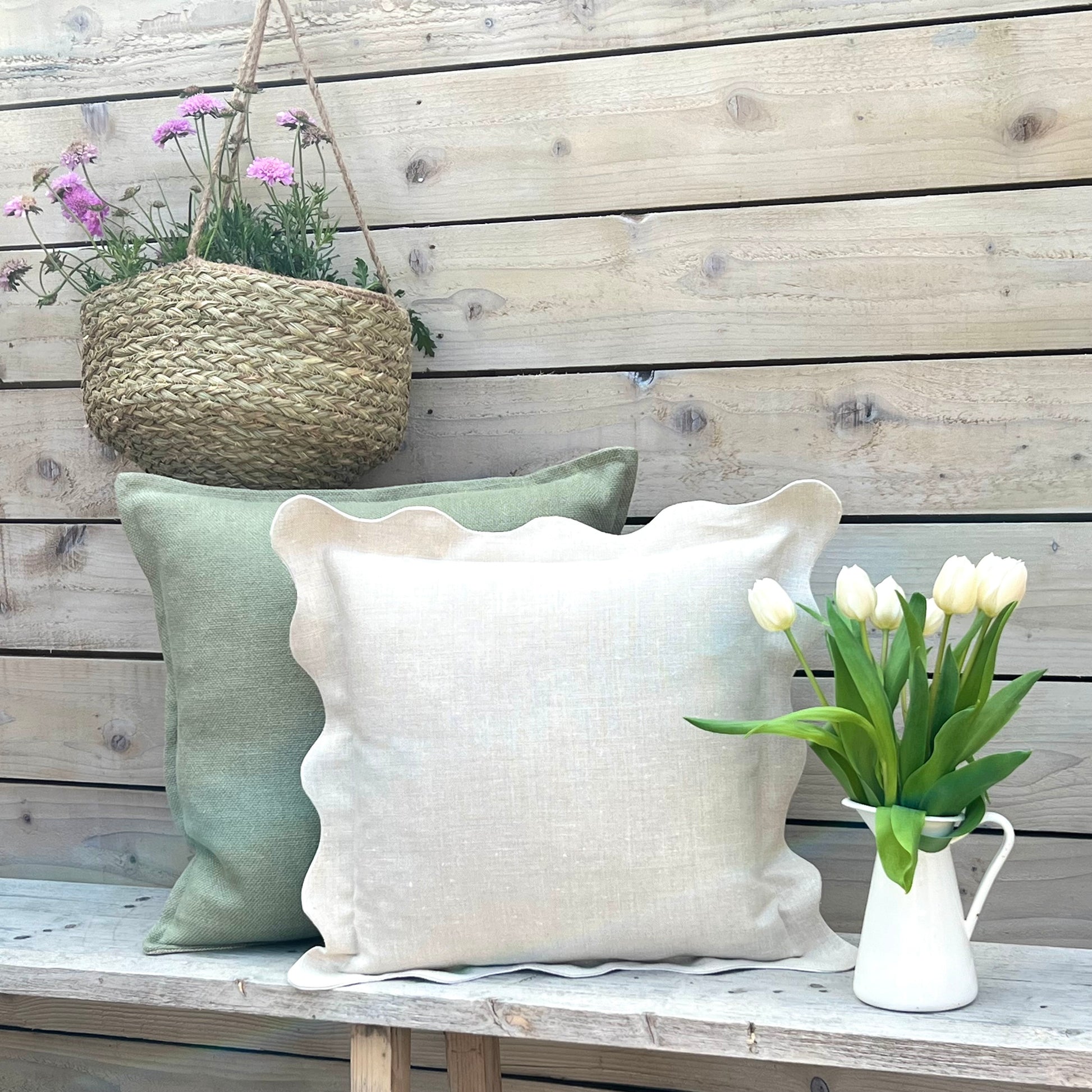 Scalloped Peony and Sage Grain Sack Stripe Cushion. Made from grain sack linen front, and a plain coordinating fabric on the back, with a pretty scolloped flanged edge.