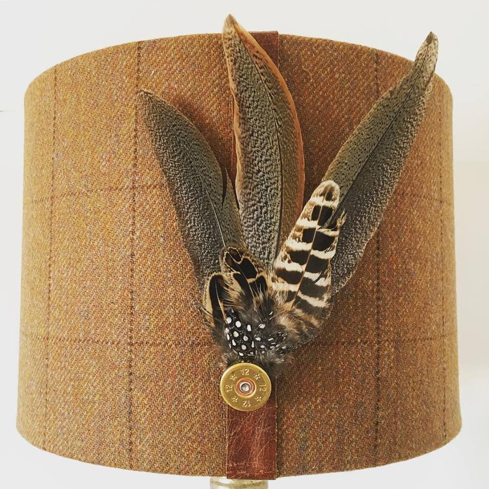 Our handmade Tweed And Feather Lampshades feature rolled edges and our signature single, leather seam. Available in a choice of our exclusive tweed fabrics, beautifully complemented with a pheasant feather arrangement and completed with a 12 gauge gun cartridge.