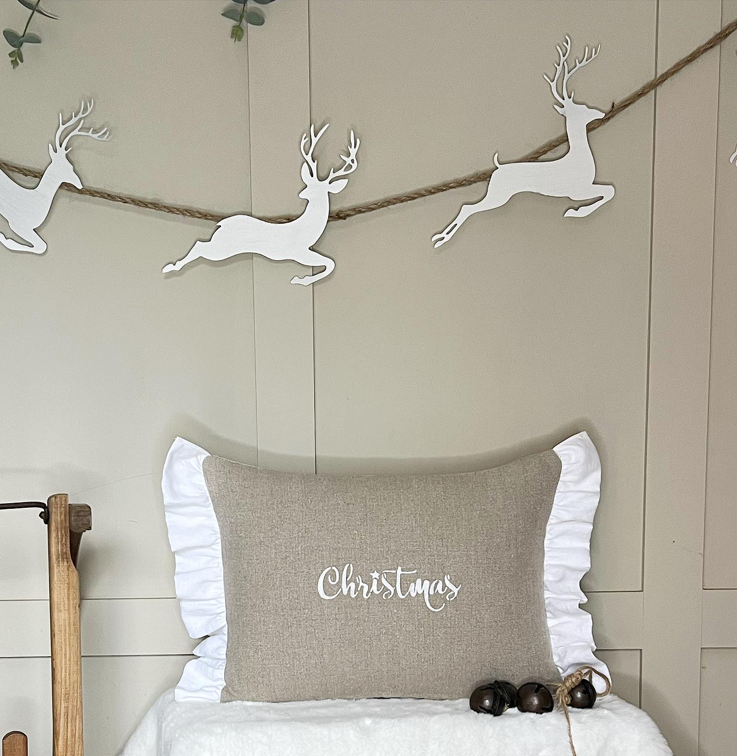 Linen Christmas Cushion, made from a beautiful Peony and Sage Linen, hand printed in white, with deep ruffled edging on the sides.