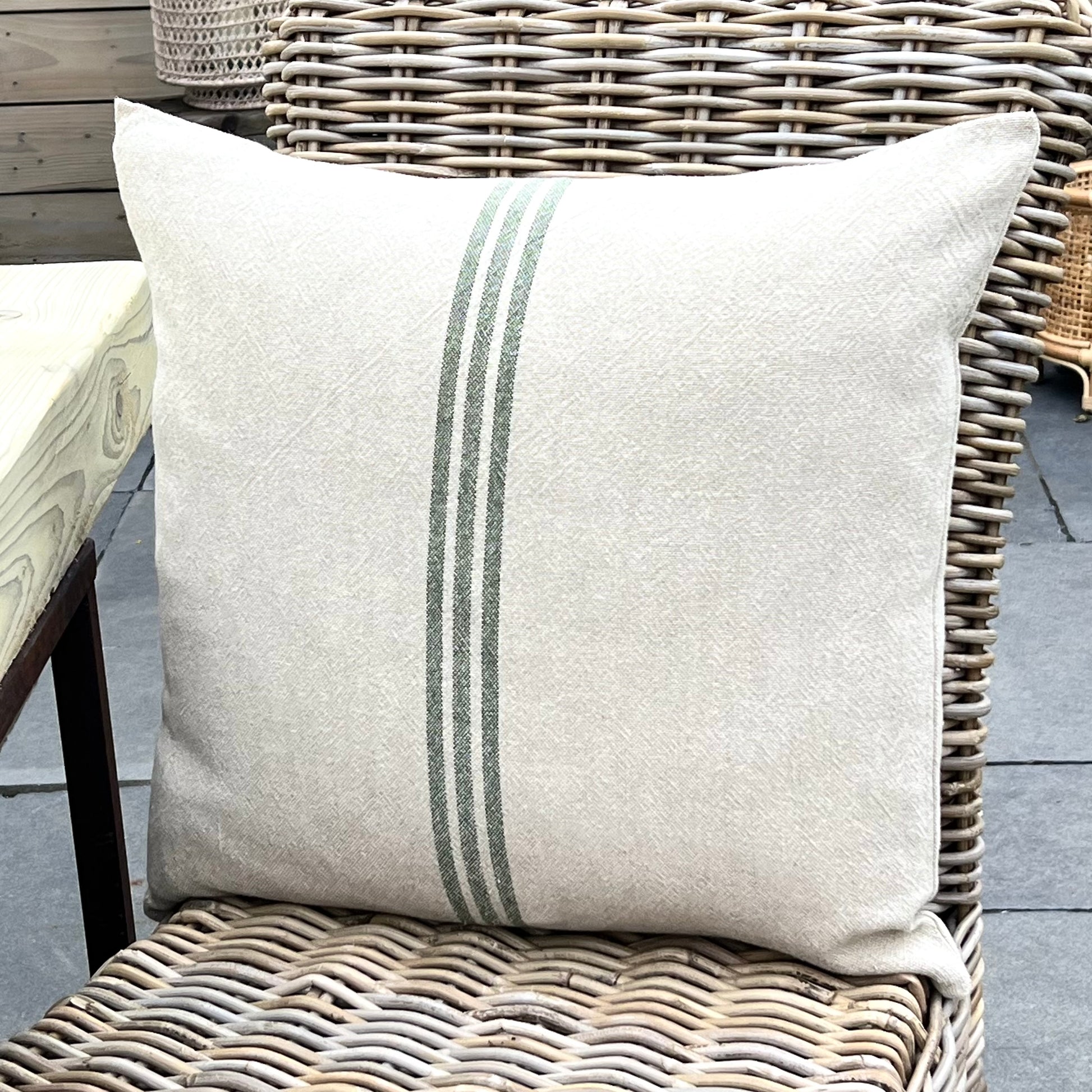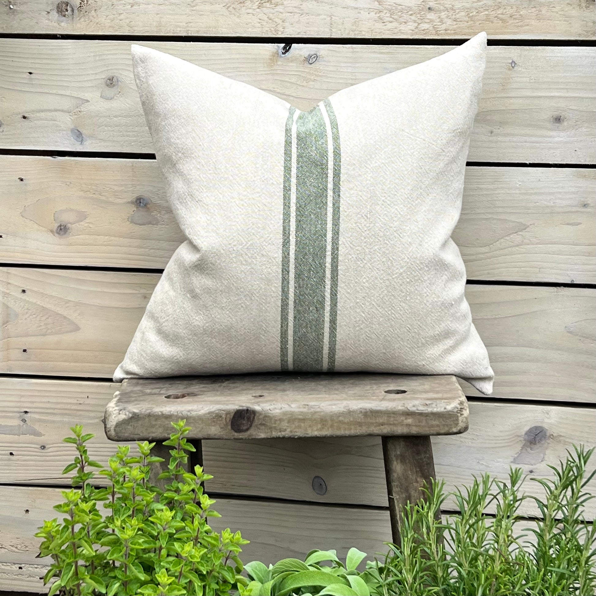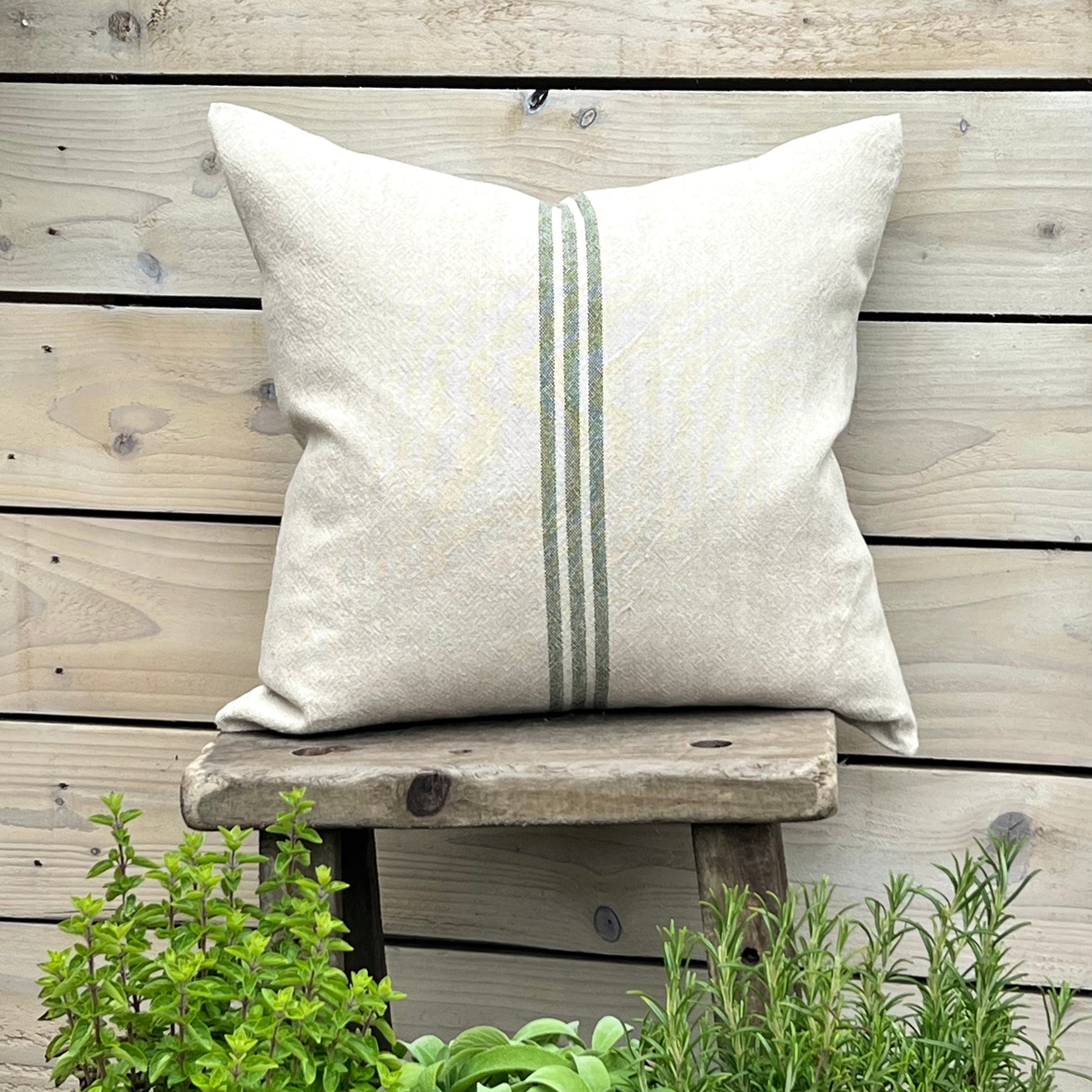 Vintage Linen Olive Stripe Cushion, with stripes on both front and back.